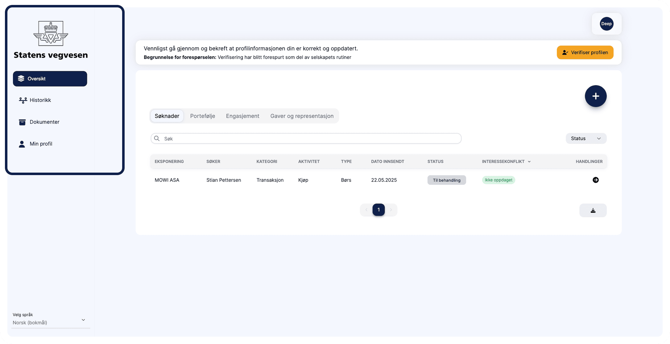 Min profil: Her kan du oppdatere din personlige innformasjon, registrere tilknyttede selskaper, nærstående personer, samt se eventuelle deltakelser i anskaffelsesprosjekter og innsidelister.